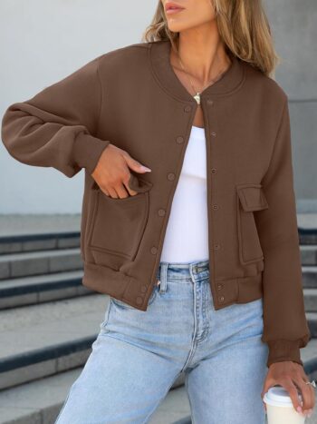 Bomber Jacket Women Varsity Casual Button Down Lightweight Fall Fashion Short School Outfits with Pockets
