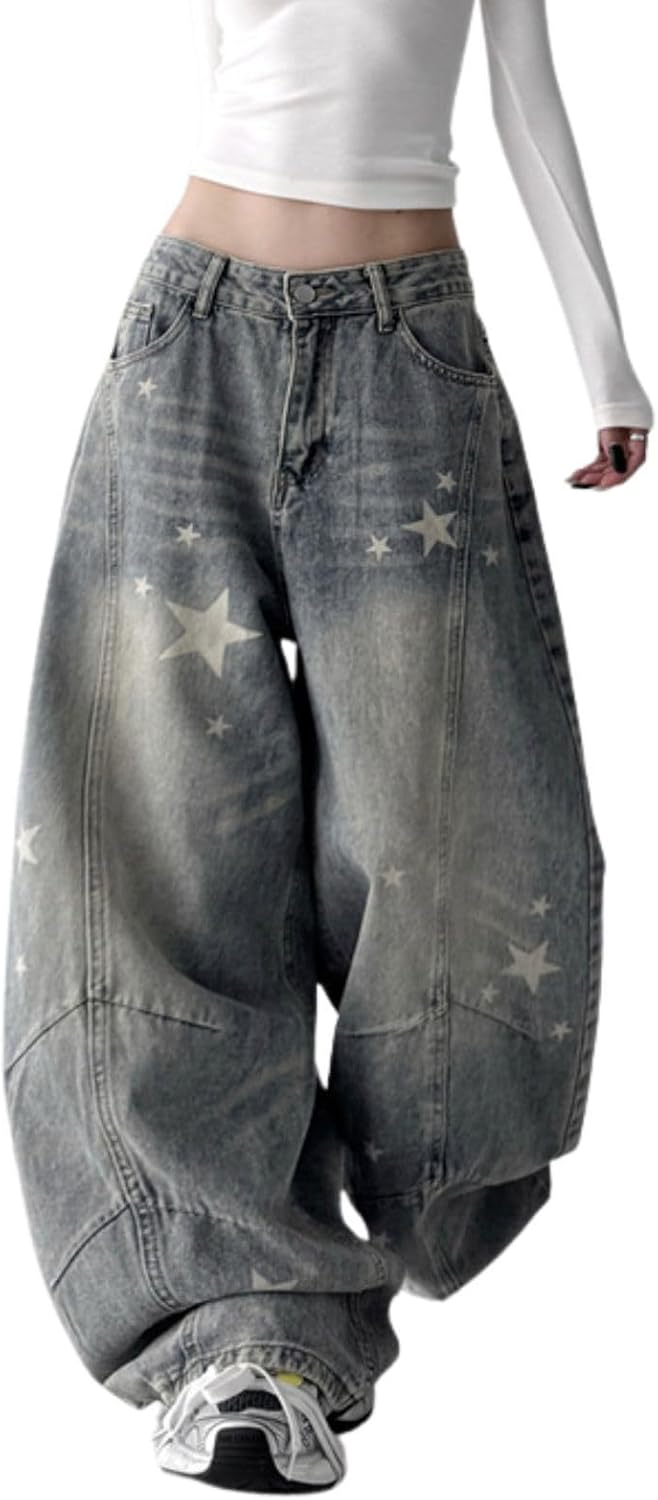 Baggy Jeans for Women Men Star Printed Barrel Jeans Low Rise Boyfriend Denim Pants Streetwear Clothes