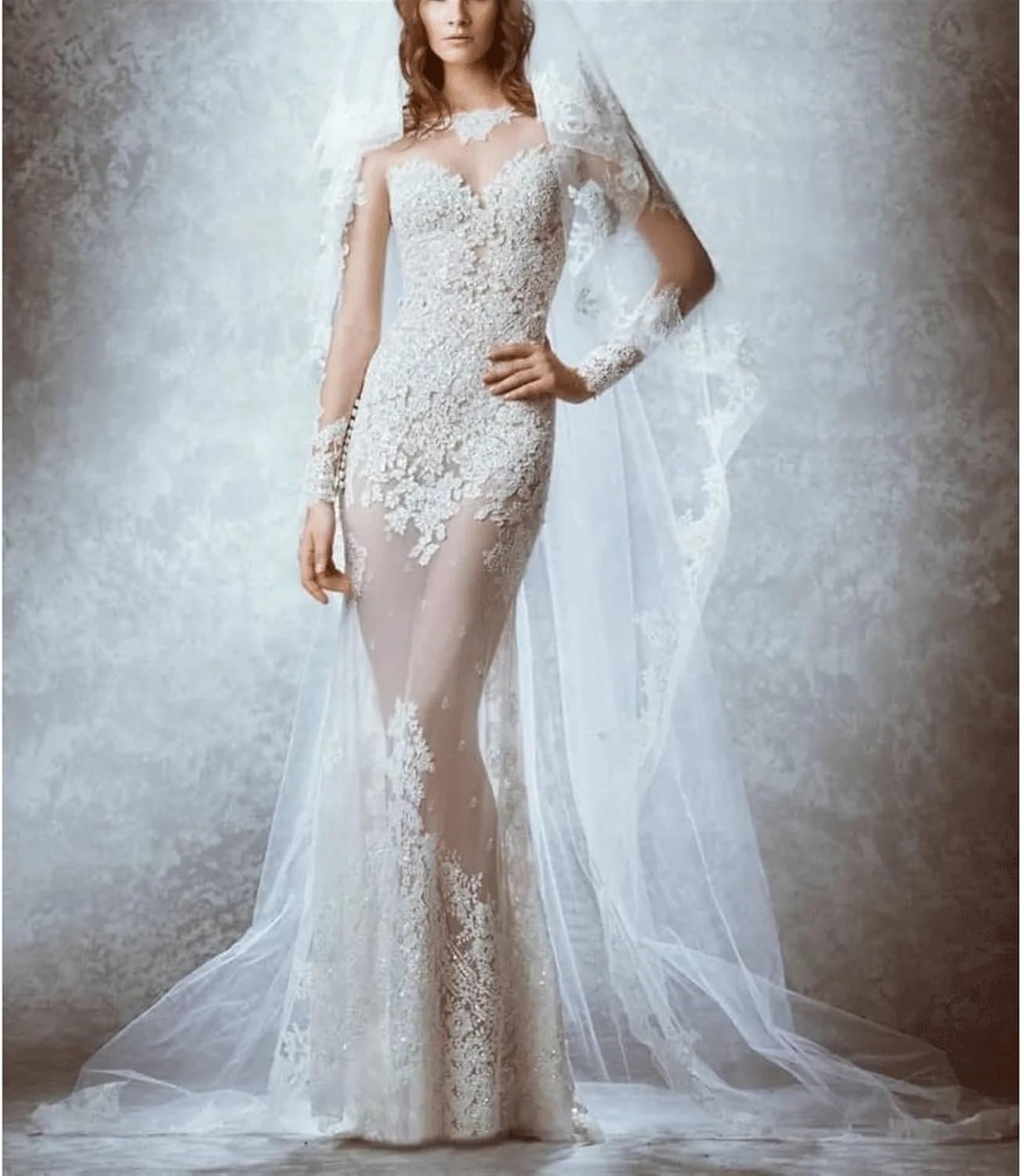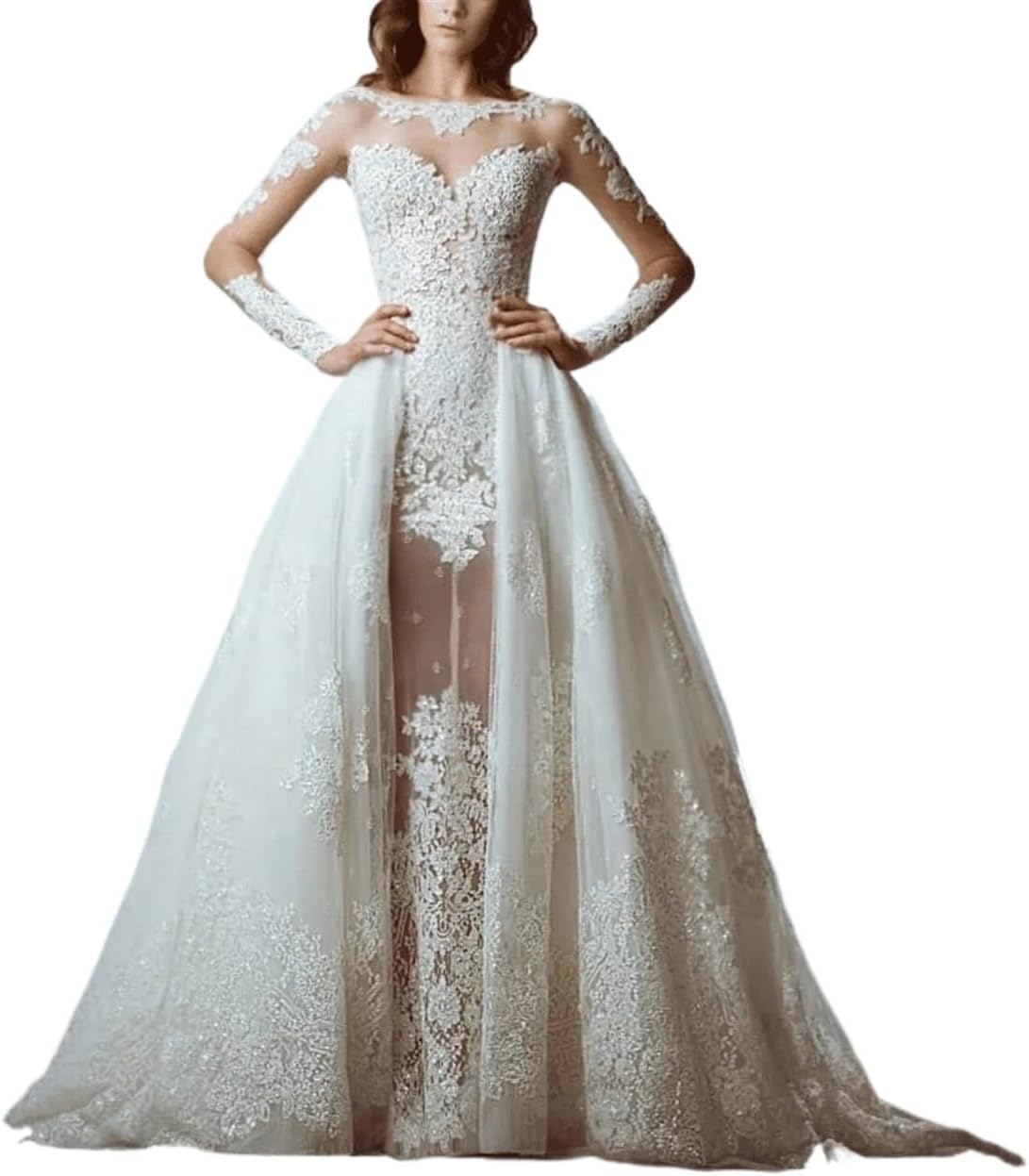 Bridal Gown Detachable Train Lace Sheer Long Sleeves Mother of the Bride Dresses