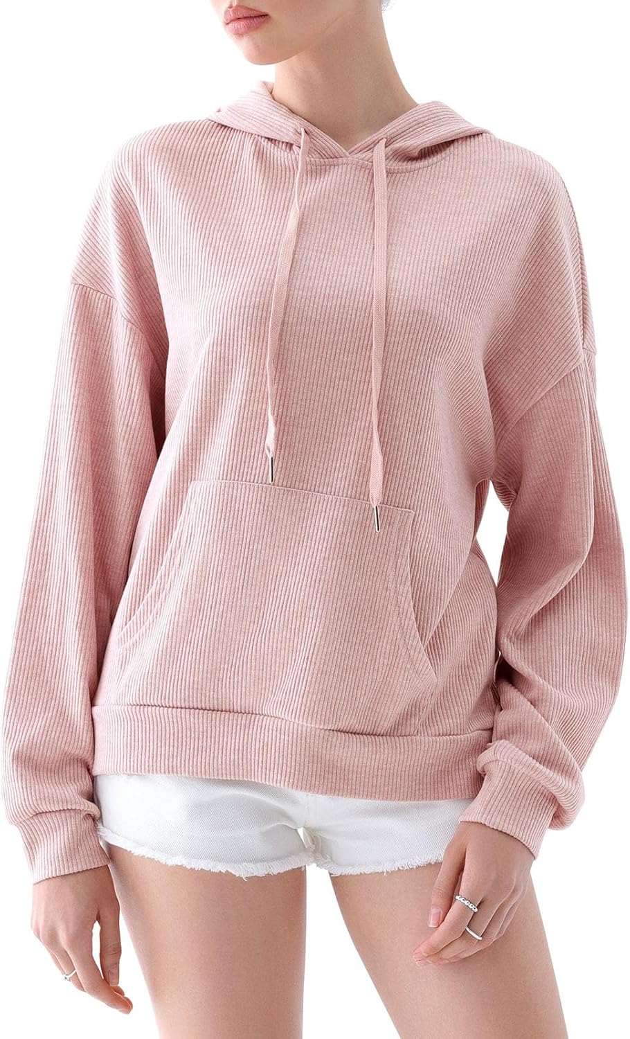 Women Drawstring Lightweight Hoodies Ribbed Knit Long Sleeve Regular Fit Pullover Sweatershirt Fall Outfits
