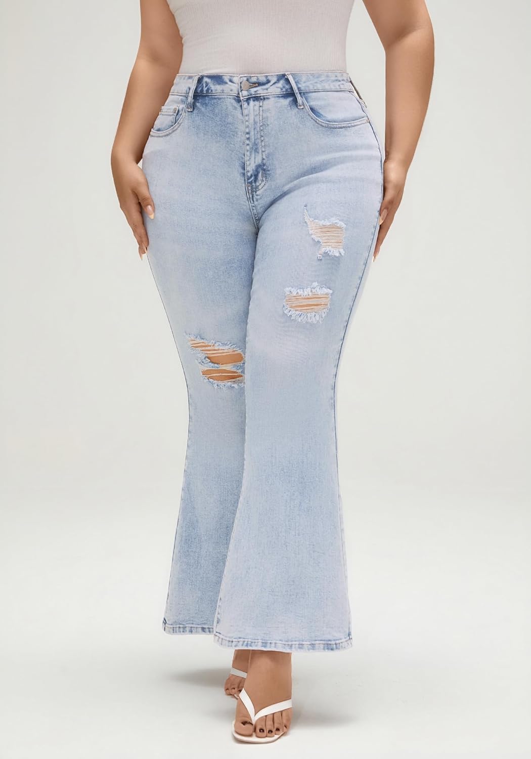 - Flared Jeans Fit Tips: Trendy jean features bell bottoms, high/mid waisted, ripped design, side seam, regular fit, zipper and basic five pockets. It has 2 waisted choice to choose, you can use it to matching with different personal type in all season
