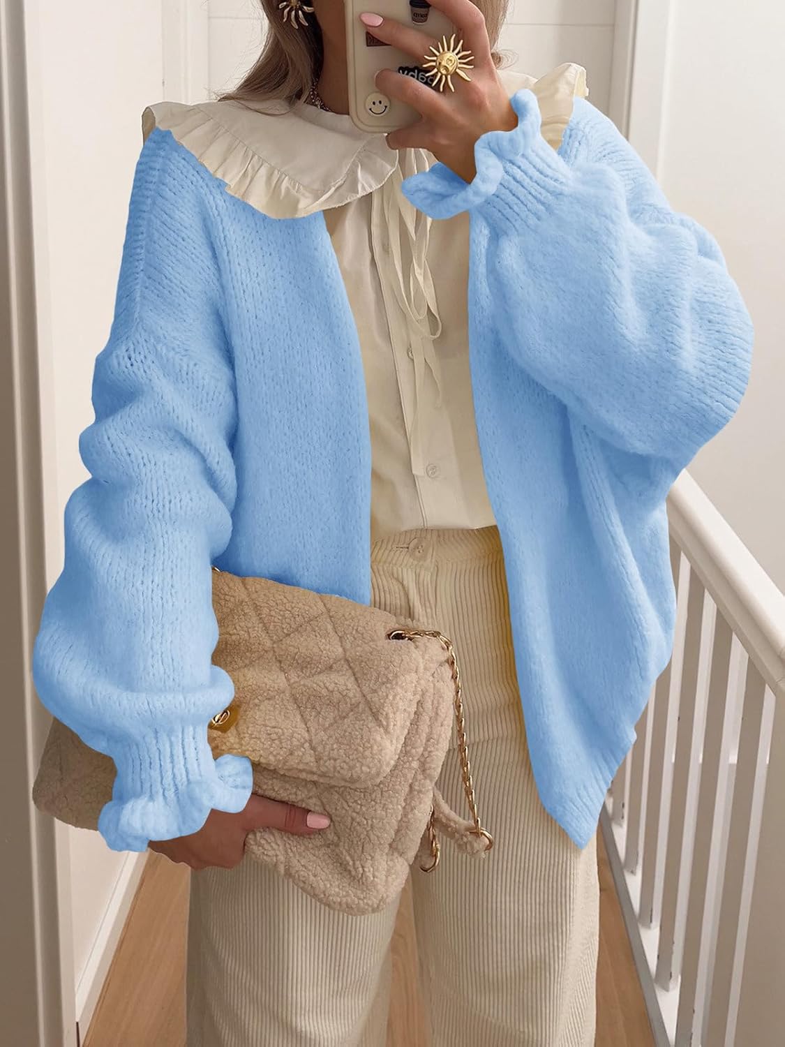 • Designs: Ruffle sleeve, open front, long lantern sleeve, loose fit, slouchy cardigan for women. Oversized cardigans for women featuring a relaxed silhouette and open front design for effortless layering. Statement lantern sleeves with ribbed cuffs add dramatic flair and contemporary style to this cozy knitwear