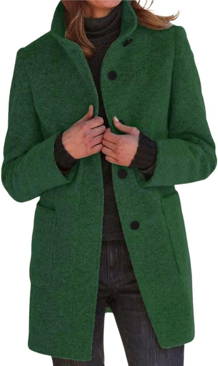 Women Winter Long Pea Coat Wool Blend Stand Collar Single Breast Thicken Blazer Jacket